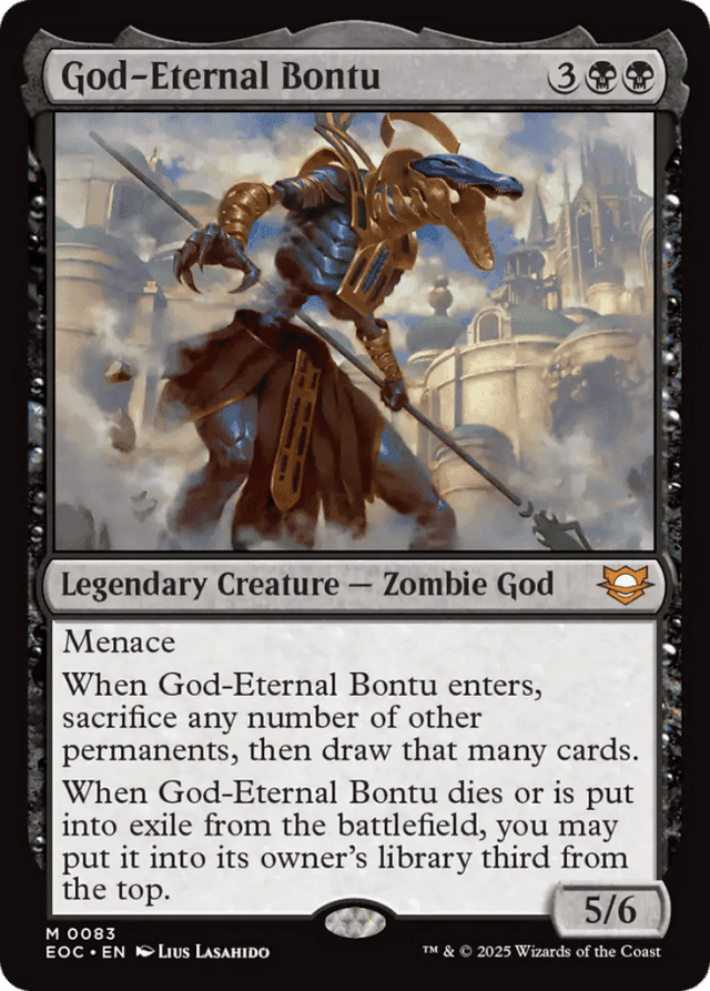 Menace When God-Eternal Bontu enters, sacrifice any number of other permanents, then draw that many cards. When God-Eternal Bontu dies or is put into exile from the battlefield, you may put it into its owner's library third from the top.