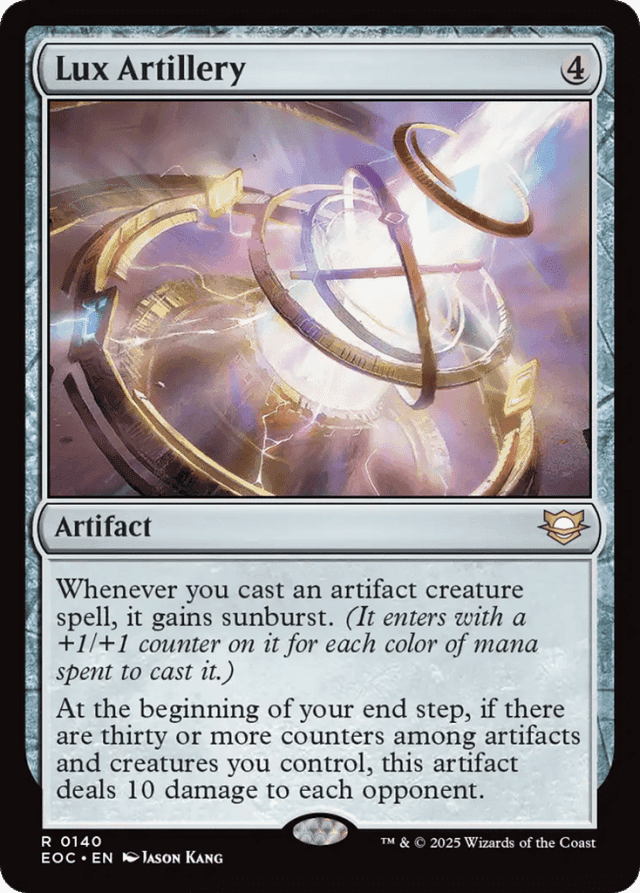 If the artifact creature already has sunburst (or if you control multiple copies of Lux Artillery), each instance of sunburst works separately. — Lux Artillery's last ability will check if there are thirty or more counters among artifacts and creatures you control as your end step begins. If there aren't, the ability won't trigger at all. If there are, the ability will check again as it tries to resolve. If the number of counters among artifacts and creatures you control has fallen below thirty, the ability won't do anything.