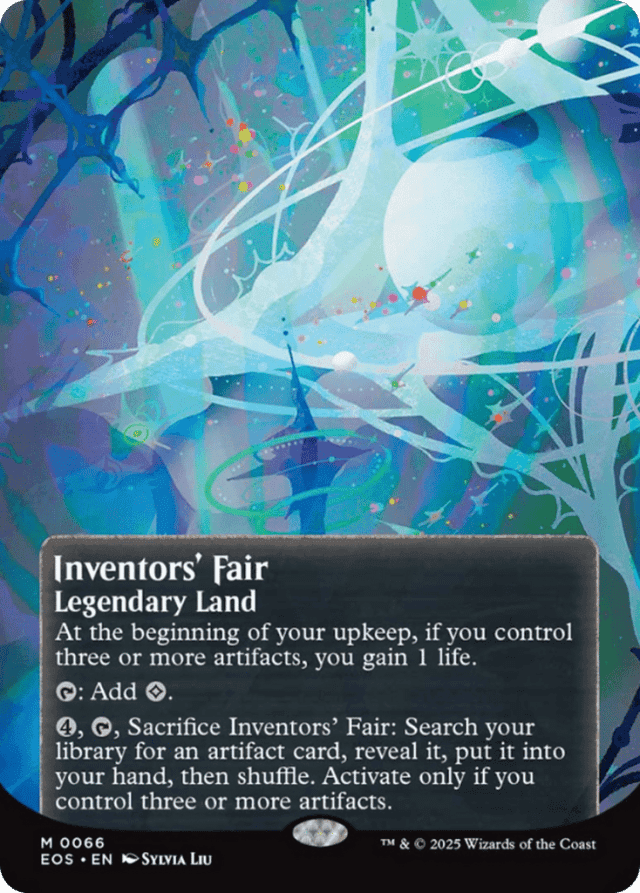 At the beginning of your upkeep, if you control three or more artifacts, you gain 1 life. {T}: Add {C}. {4}, {T}, Sacrifice Inventors' Fair: Search your library for an artifact card, reveal it, put it into your hand, then shuffle. Activate only if you control three or more artifacts.