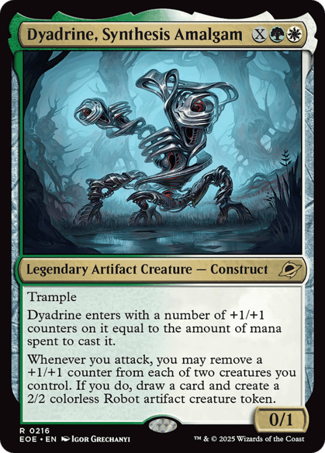 Trample Dyadrine enters with a number of +1/+1 counters on it equal to the amount of mana spent to cast it. Whenever you attack, you may remove a +1/+1 counter from each of two creatures you control. If you do, draw a card and create a 2/2 colorless Robot artifact creature token.