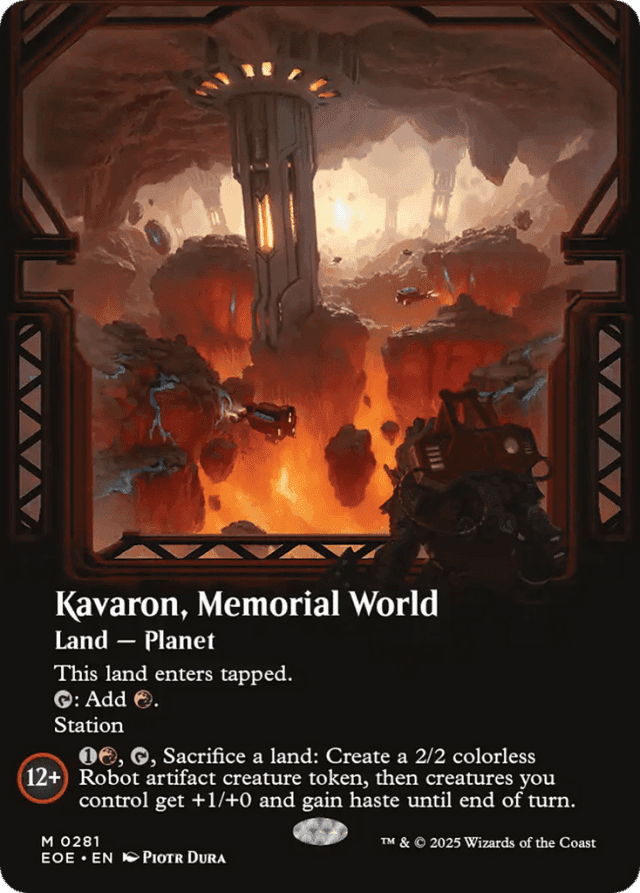 This land enters tapped. {T}: Add {R}. Station (Tap another creature you control: Put charge counters equal to its power on this Planet. Station only as a sorcery.) Station 12+: {1}{R}, {T}, Sacrifice a land: Create a 2/2 colorless Robot artifact creature token, then creatures you control get +1/+0 and gain haste until end of turn.