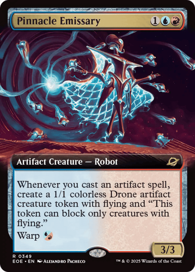 Whenever you cast an artifact spell, create a 1/1 colorless Drone artifact creature token with flying and "This token can block only creatures with flying." Warp {U/R} (You may cast this card from your hand for its warp cost. Exile this creature at the beginning of the next end step, then you may cast it from exile on a later turn.)