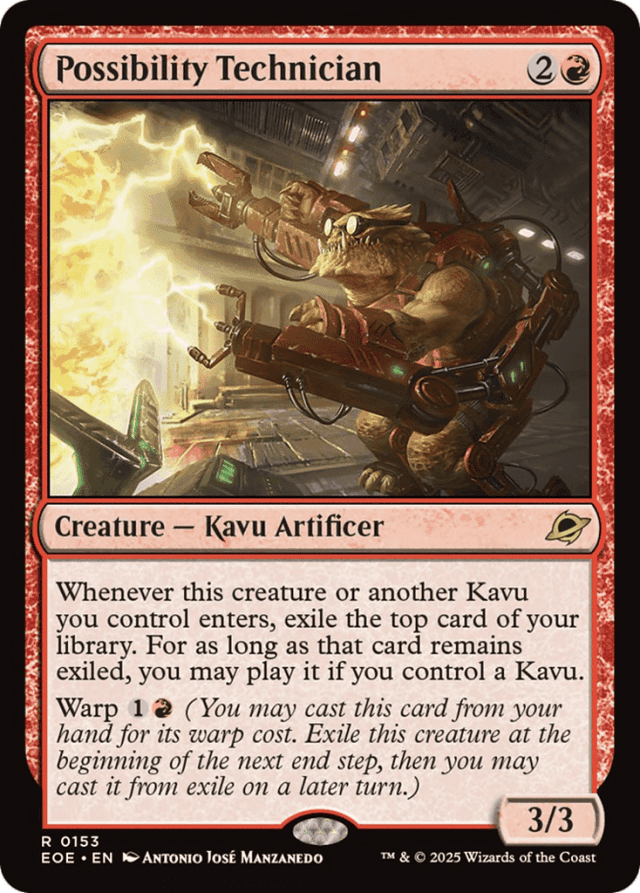 Whenever this creature or another Kavu you control enters, exile the top card of your library. For as long as that card remains exiled, you may play it if you control a Kavu. Warp {1}{R} (You may cast this card from your hand for its warp cost. Exile this creature at the beginning of the next end step, then you may cast it from exile on a later turn.)