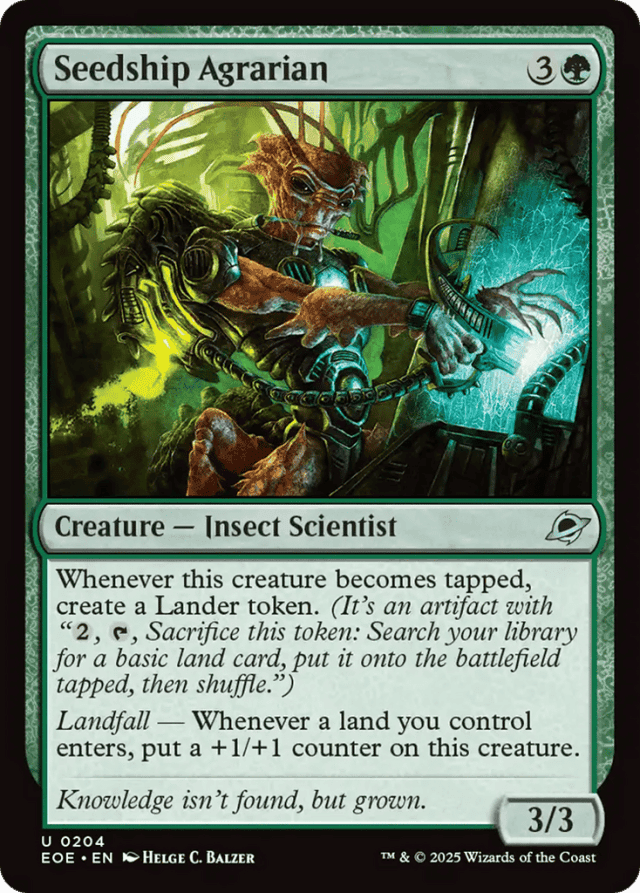 Whenever this creature becomes tapped, create a Lander token. (It's an artifact with "{2}, {T}, Sacrifice this token: Search your library for a basic land card, put it onto the battlefield tapped, then shuffle.") Landfall — Whenever a land you control enters, put a +1/+1 counter on this creature.
