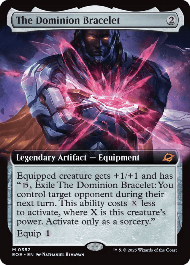 Equipped creature gets +1/+1 and has "{15}, Exile The Dominion Bracelet: You control target opponent during their next turn. This ability costs {X} less to activate, where X is this creature's power. Activate only as a sorcery." (You see all cards that player could see and make all decisions for them.) Equip {1}