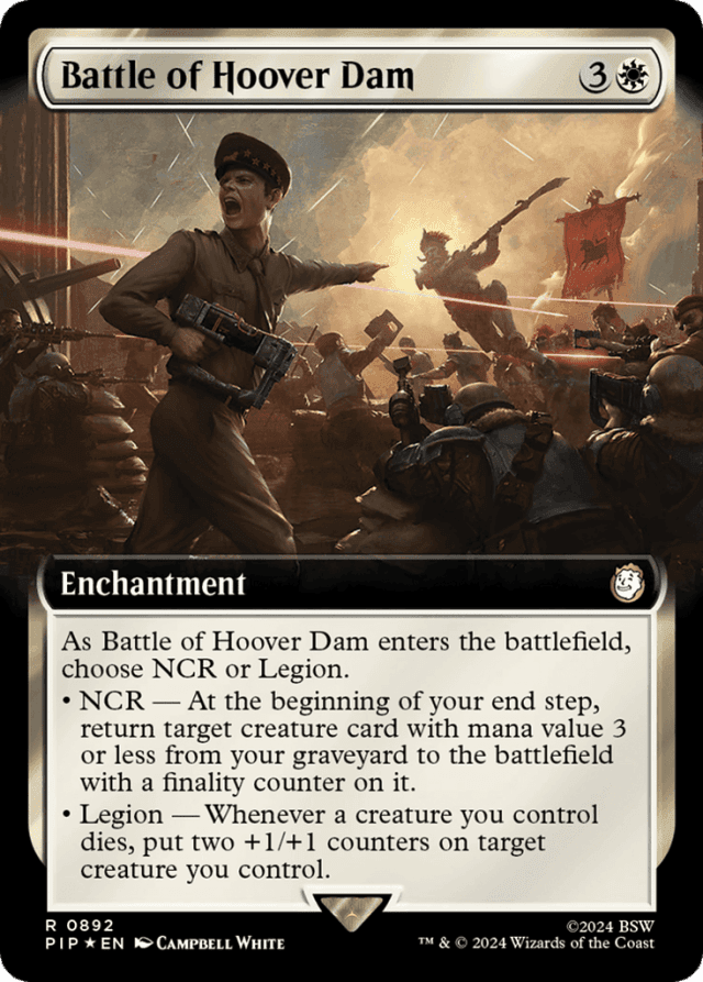 As this enchantment enters, choose NCR or Legion. • NCR — At the beginning of your end step, return target creature card with mana value 3 or less from your graveyard to the battlefield with a finality counter on it. • Legion — Whenever a creature you control dies, put two +1/+1 counters on target creature you control.