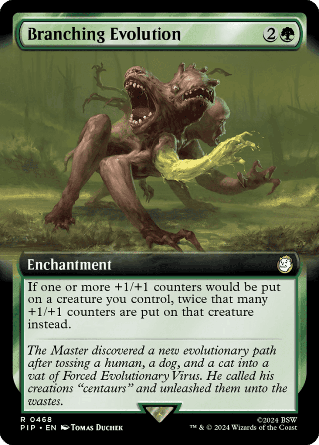 If a creature you control would enter the battlefield with a number of +1/+1 counters on it, it enters with twice that many instead. — If two or more effects attempt to modify how many counters would be put onto a creature you control, you choose the order to apply those effects, no matter who controls the sources of those effects. — If you control two Branching Evolutions, the number of +1/+1 counters put on a creature is four times the original number. Three Branching Evolutions multiplies the original number by eight, and so on.