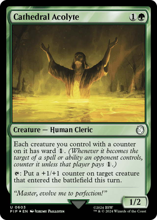 Once a creature’s ward ability has triggered, causing that creature to lose ward by removing Cathedral Acolyte won’t affect the ability. The appropriate player will still have to pay {1} or see their spell or ability countered. — The effect of Cathedral Acolyte’s first ability applies to any creature you control with a counter on it, not just ones with +1/+1 counters.