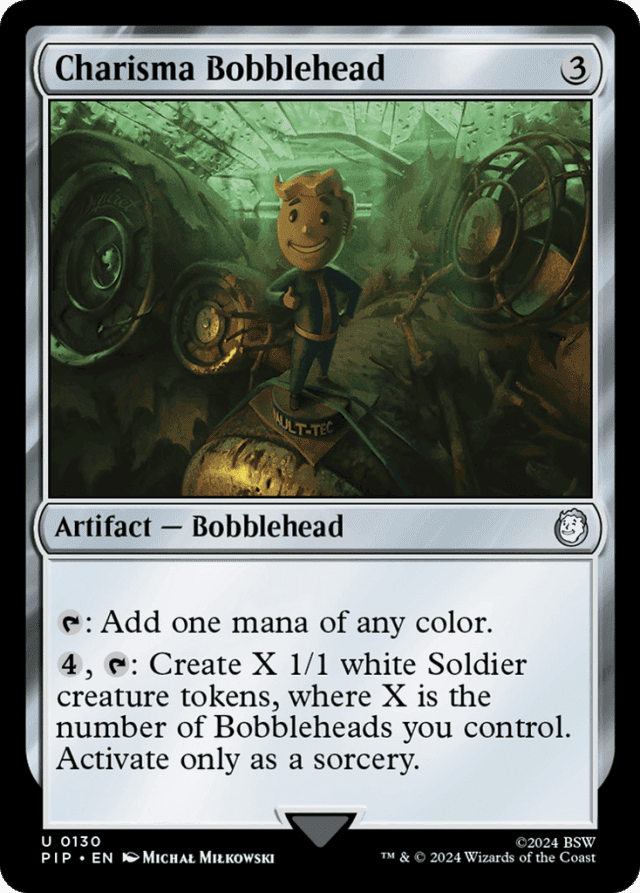 {T}: Add one mana of any color. {4}, {T}: Create X 1/1 white Soldier creature tokens, where X is the number of Bobbleheads you control. Activate only as a sorcery.