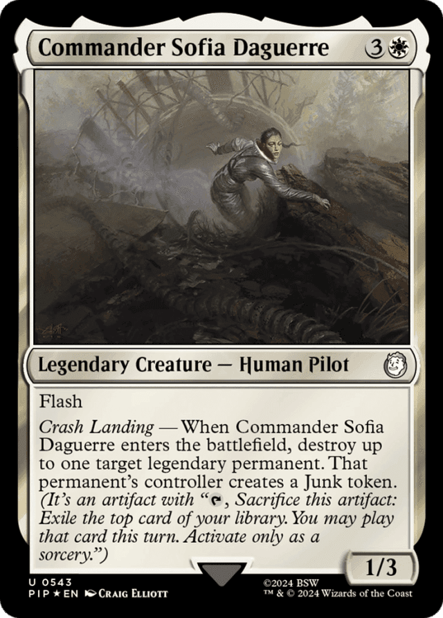 Flash Crash Landing — When Commander Sofia Daguerre enters, destroy up to one target legendary permanent. That permanent's controller creates a Junk token. (It's an artifact with "{T}, Sacrifice this token: Exile the top card of your library. You may play that card this turn. Activate only as a sorcery.")