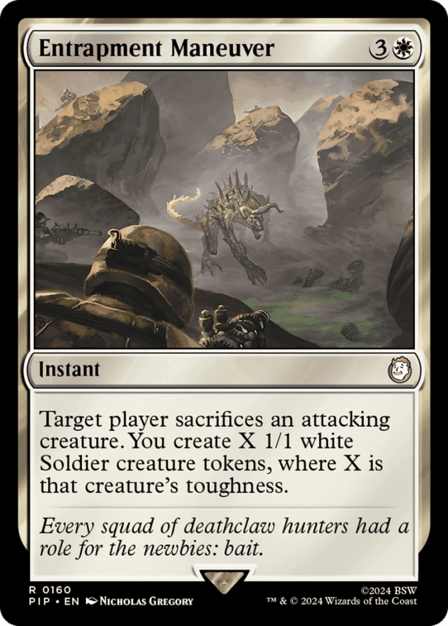 An "attacking creature" is one that has been declared as an attacker or put onto the battlefield attacking during this combat. Unless that creature leaves combat, it continues to be an attacking creature through the end of combat step, even if the player it was attacking has left the game or the planeswalker it was attacking has left combat. — Entrapment Maneuver doesn't target the creature to be sacrificed. The target player chooses one as it resolves. No player may take any other actions between the target player choosing the creature and you creating Soldier tokens. — If you cast Entrapment Maneuver after combat damage has been dealt, only creatures that survived combat can be sacrificed. — To determine how many Soldier tokens are created, use the toughness of the sacrificed creature as it last existed on the battlefield.