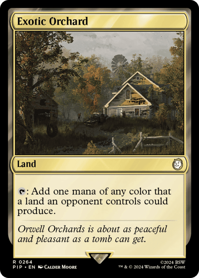 Exotic Orchard checks the effects of all mana-producing abilities of lands your opponents control, but it doesn't check their costs. For example, Vivid Crag has the ability "{T}, Remove a charge counter from Vivid Crag: Add one mana of any color." If an opponent controls Vivid Crag and you control Exotic Orchard, you can tap Exotic Orchard for any color of mana. It doesn't matter whether Vivid Crag has a charge counter on it, and it doesn't matter whether it's untapped. — Exotic Orchard doesn't care about any restrictions or riders your opponents' lands (such as Ancient Ziggurat or Hall of the Bandit Lord) put on the mana they produce. It just cares about colors of mana. — Lands that produce mana based only on what other lands "could produce" won't help each other unless some other land allows one of them to actually produce some type of mana. For example, if you control an Exotic Orchard and your opponent controls an Exotic Orchard and a Reflecting Pool, none of those lands would produce mana if their mana abilities were activated. On the other hand, if you control a Forest and an Exotic Orchard, and your opponent controls an Exotic Orchard and a Reflecting Pool, then each of those lands can be tapped to produce {G}. Your opponent's Exotic Orchard can produce {G} because you control a Forest. Your Exotic Orchard and your opponent's Reflecting Pool can each produce {G} because your opponent's Exotic Orchard can produce {G}. — The colors of mana are white, blue, black, red, and green. Exotic Orchard can't be tapped for colorless mana, even if a land an opponent controls could produce colorless mana. — When determining what colors of mana your opponents' lands could produce, Exotic Orchard takes into account any applicable replacement effects that would apply to those lands' mana abilities (such as Contamination's effect, for example). If there are more than one, consider them in any possible order.