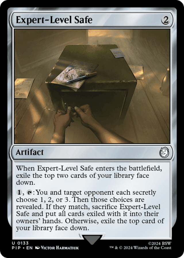To secretly choose the numbers, you and the target opponent should each write down your choice of 1, 2, or 3 without showing them to anyone else. Keep those choices secret until they’re simultaneously revealed. — You don’t get to look at the cards exiled by Expert-Level Safe’s abilities.