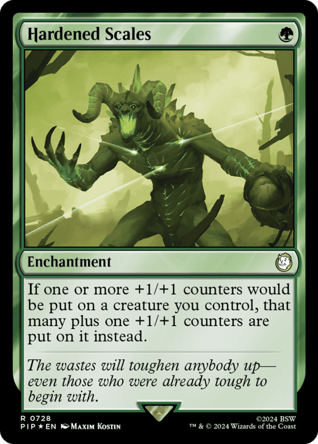 Each additional Hardened Scales you control will increase the number of +1/+1 counters placed on a creature you control by one. — If a creature you control would enter the battlefield with a number of +1/+1 counters on it, it enters with that many plus one instead. — If two or more effects attempt to modify how many counters would be put on a creature you control, you choose the order to apply those effects, no matter who controls the sources of those effects.