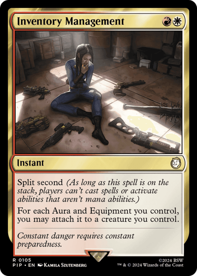 Split second (As long as this spell is on the stack, players can't cast spells or activate abilities that aren't mana abilities.) For each Aura and Equipment you control, you may attach it to a creature you control.