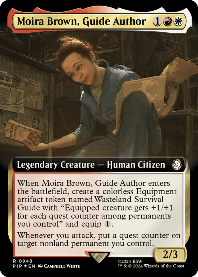 When Moira Brown enters, create a colorless Equipment artifact token named Wasteland Survival Guide with "Equipped creature gets +1/+1 for each quest counter among permanents you control" and equip {1}. Whenever you attack, put a quest counter on target nonland permanent you control.