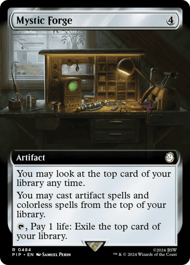 Because you never "cast" a land card, Mystic Forge doesn't allow you to play an artifact land from the top of your library. — If the top card of your library changes while you're casting a spell, playing a land, or activating an ability, you can't look at the new top card until you finish doing so. This means that if you cast the top card of your library, you can't look at the next one until you're done paying for that spell. — If the top card of your library has a morph ability, you can cast it face down from the top of your library, even if it's normally not a colorless card. — Mystic Forge lets you look at the top card of your library whenever you want (with one restriction—see below), even if you don't have priority. This action doesn't use the stack. Knowing what that card is becomes part of the information you have access to, just like you can look at the cards in your hand. — You must follow the normal timing permissions and restrictions of the spells you cast from your library. — You still pay all costs for a spell you cast from your library, including additional costs. You may also pay alternative costs.