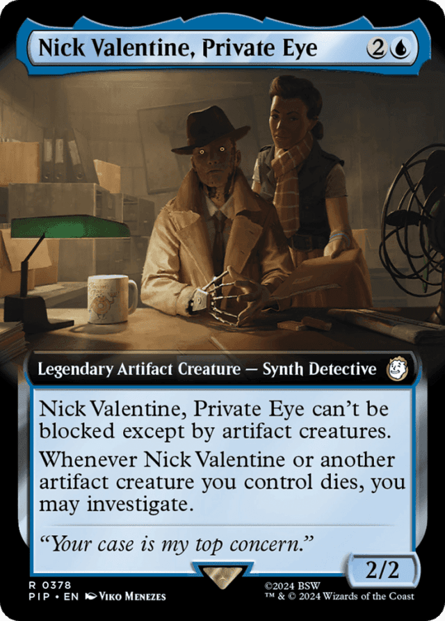 Nick Valentine can't be blocked except by artifact creatures. Whenever Nick Valentine or another artifact creature you control dies, you may investigate. (To investigate, create a Clue token. It's an artifact with "{2}, Sacrifice this token: Draw a card.")