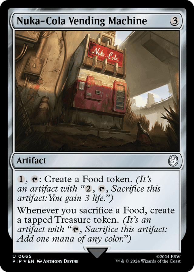 If an effect refers to a Food, it means any Food artifact, not just a Food artifact token. For example, if you sacrifice a nontoken Food artifact, such as Candy Trail from the Wilds of Eldraine set, Nuka-Cola Vending Machine's last ability will trigger. — Nuka-Cola Vending Machine's last ability triggers whenever you sacrifice a Food for any reason, not just to activate a Food's activated ability. — Food is an artifact type. Even though it appears on some creatures, it's never a creature type. — Whatever you do, don't eat the delicious cards. — You can't sacrifice a Food to pay multiple costs. For example, you can't sacrifice a Food token to activate its own ability and also to activate Maraleaf Rider's ability.