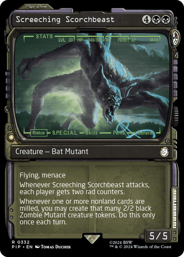Flying, menace Whenever this creature attacks, each player gets two rad counters. Whenever one or more nonland cards are milled, you may create that many 2/2 black Zombie Mutant creature tokens. Do this only once each turn.