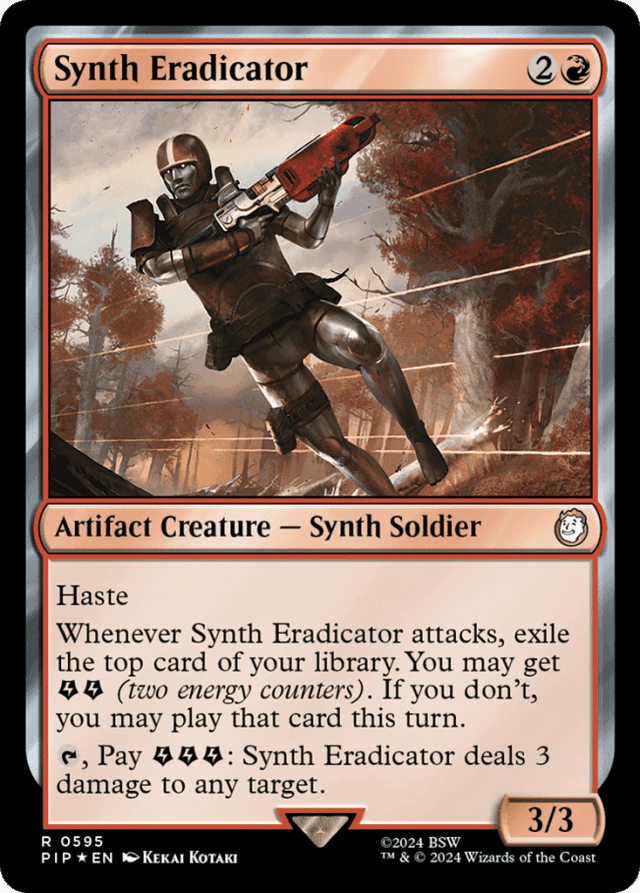 Haste Whenever this creature attacks, exile the top card of your library. You may get {E}{E} (two energy counters). If you don't, you may play that card this turn. {T}, Pay {E}{E}{E}: This creature deals 3 damage to any target.