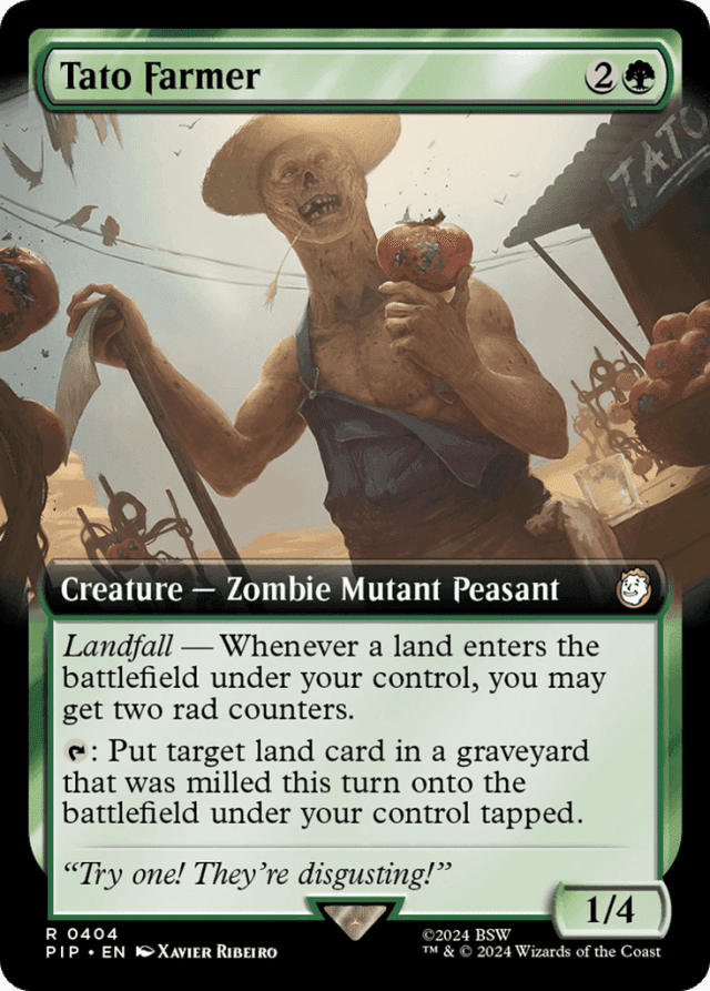 Landfall — Whenever a land you control enters, you may get two rad counters. {T}: Put target land card in a graveyard that was milled this turn onto the battlefield under your control tapped.