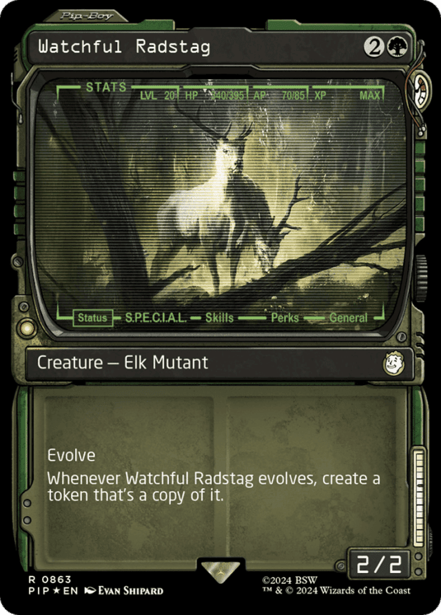 Any effects (such as proliferate) that interact with counters a player gets, has, or loses can interact with rad counters. — If Watchful Radstag leaves the battlefield before its last ability resolves, the token will still enter the battlefield as a copy of Watchful Radstag, using Watchful Radstag’s copiable values from when it was last on the battlefield. — If a creature enters the battlefield with +1/+1 counters on it, consider those counters when determining if evolve will trigger. For example, a 1/1 creature that enters the battlefield with two +1/+1 counters on it will cause the evolve ability of a 2/2 creature to trigger. — If a player has fewer cards remaining in their library than the number of rad counters they have when the triggered ability resolves, they’ll mill as many cards as they can. — If evolve triggers, the stat comparison will happen again when the ability tries to resolve. If neither stat of the new creature is greater, the ability will do nothing. If the creature that entered the battlefield leaves the battlefield before evolve tries to resolve, use its last known power and toughness to compare the stats. — If multiple creatures enter the battlefield at the same time, evolve may trigger multiple times, although the stat comparison will take place each time one of those abilities tries to resolve. For example, if you control a 2/2 creature with evolve and two 3/3 creatures enter the battlefield, evolve will trigger twice. The first ability will resolve and put a +1/+1 counter on the creature with evolve. When the second ability tries to resolve, neither the power nor the toughness of the new creature is greater than that of the creature with evolve, so that ability does nothing. — In a game using the shared team turns option, such as an Archenemy or Two-Headed Giant game, the inherent triggered ability associated with rad counters triggers once for each player on the active team that has rad counters. Each instance of that ability is controlled by one of those players. — Keep track of how many rad counters each player has. Potential ways to track this include writing them down on paper or using dice, but any method that is clear and mutually agreeable is fine. — Rad counters are a kind of counter that a player may have. They’re not associated with any specific permanents. — Rad counters don’t go away as steps, phases, or turns end. They only go away when an effect instructs a player to remove rad counters from themselves. — The cards are milled all at once, which means abilities that trigger “whenever one or more nonland cards are milled” will trigger exactly once as long as at least one nonland card was milled. — The token copy will have Watchful Radstag’s abilities. It will also be able to create copies of itself. — The token copy won’t copy counters or damage marked on Watchful Radstag, nor will it copy other effects that have changed Watchful Radstag’s power, toughness, types, color, and so on. Normally, this means the token will simply be a Watchful Radstag, but if any copy effects have affected the original Watchful Radstag, the token will take those into account. — There is an inherent triggered ability associated with having rad counters. This triggered ability has no source and is controlled by the active player. The full text of this ability is “At the beginning of the precombat main phase of a player with rad counters, that player mills cards equal to the number of rad counters they have. For each nonland card milled this way, that player loses 1 life and removes one rad counter from themselves.” — Watchful Radstag “evolves” when its evolve ability resolves and a +1/+1 counter is put on it. If a replacement effect causes the evolve ability to put more than one +1/+1 counter on Watchful Radstag, its last ability triggers only once. If no +1/+1 counter is put on it (perhaps because it left the battlefield while its evolve ability was still on the stack), then its last ability doesn’t trigger. — Watchful Radstag’s last ability won’t trigger if a +1/+1 counter is put on it for any reason other than its evolve ability resolving. — When comparing the stats as the evolve ability resolves, it’s possible that the stat that’s greater changes from power to toughness or vice versa. If this happens, the ability will still resolve and you’ll put a +1/+1 counter on the creature with evolve. For example, if you control a 2/2 creature with evolve and a 1/3 creature enters the battlefield under your control, its toughness is greater, so evolve will trigger. In response, the 1/3 creature gets +2/-2. When the evolve trigger tries to resolve, its power is greater. You’ll put a +1/+1 counter on the creature with evolve. — When comparing the stats of the two creatures for evolve, you always compare power to power and toughness to toughness. — Whenever a creature enters the battlefield under your control, check its power and toughness against the power and toughness of the creature with evolve. If neither stat of the new creature is greater, evolve won’t trigger at all.