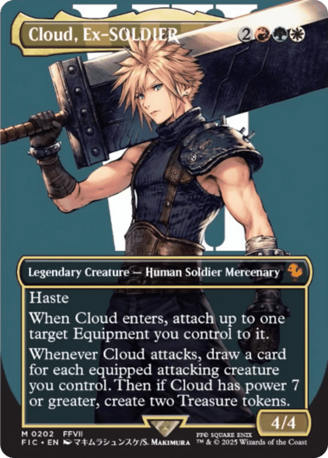 Haste When Cloud enters, attach up to one target Equipment you control to it. Whenever Cloud attacks, draw a card for each equipped attacking creature you control. Then if Cloud has power 7 or greater, create two Treasure tokens.
