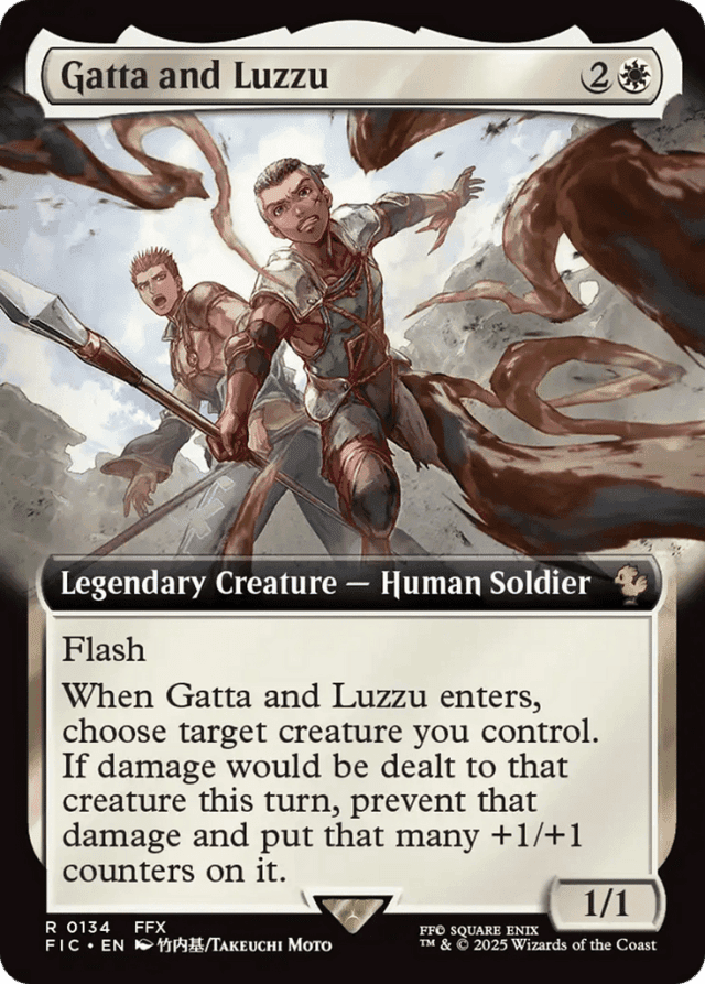 Flash When Gatta and Luzzu enters, choose target creature you control. If damage would be dealt to that creature this turn, prevent that damage and put that many +1/+1 counters on it.