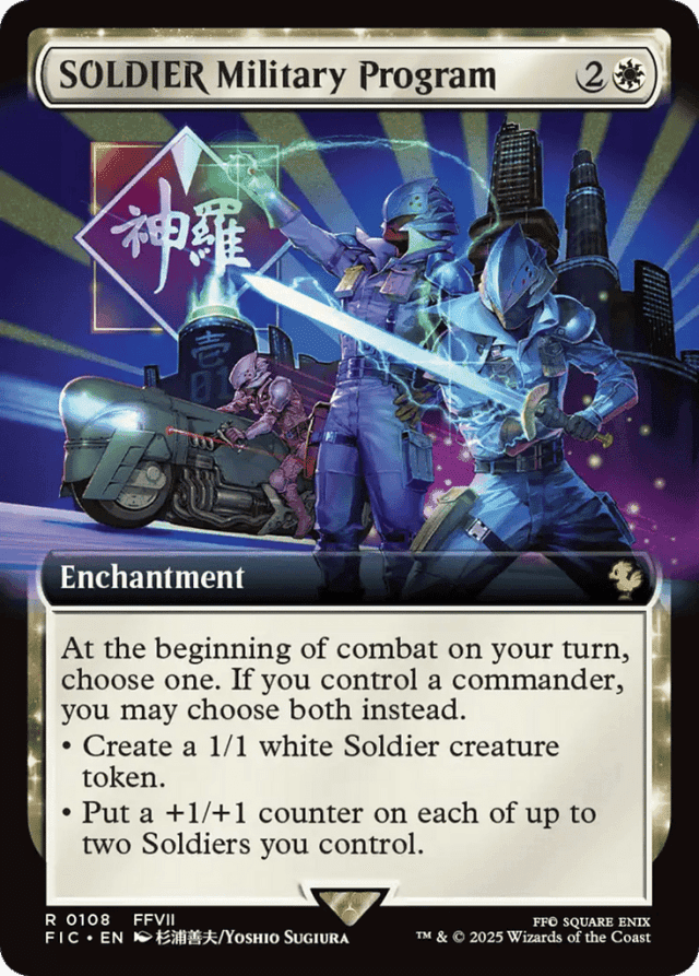 At the beginning of combat on your turn, choose one. If you control a commander, you may choose both instead. • Create a 1/1 white Soldier creature token. • Put a +1/+1 counter on each of up to two Soldiers you control.