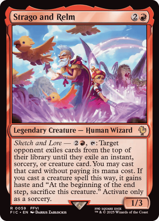 Sketch and Lore — {2}{R}, {T}: Target opponent exiles cards from the top of their library until they exile an instant, sorcery, or creature card. You may cast that card without paying its mana cost. If you cast a creature spell this way, it gains haste and "At the beginning of the end step, sacrifice this creature." Activate only as a sorcery.