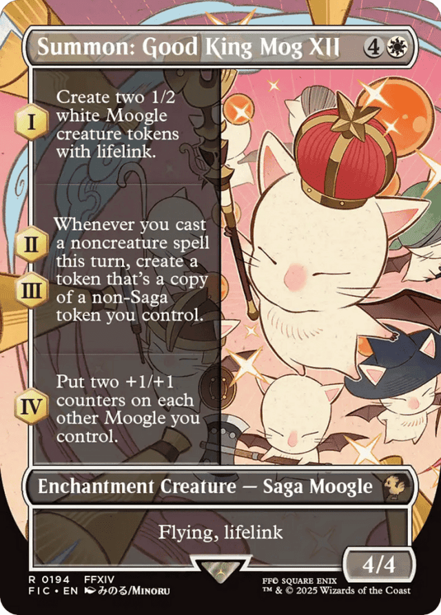 (As this Saga enters and after your draw step, add a lore counter. Sacrifice after IV.) I — Create two 1/2 white Moogle creature tokens with lifelink. II, III — Whenever you cast a noncreature spell this turn, create a token that's a copy of a non-Saga token you control. IV — Put two +1/+1 counters on each other Moogle you control. Flying, lifelink