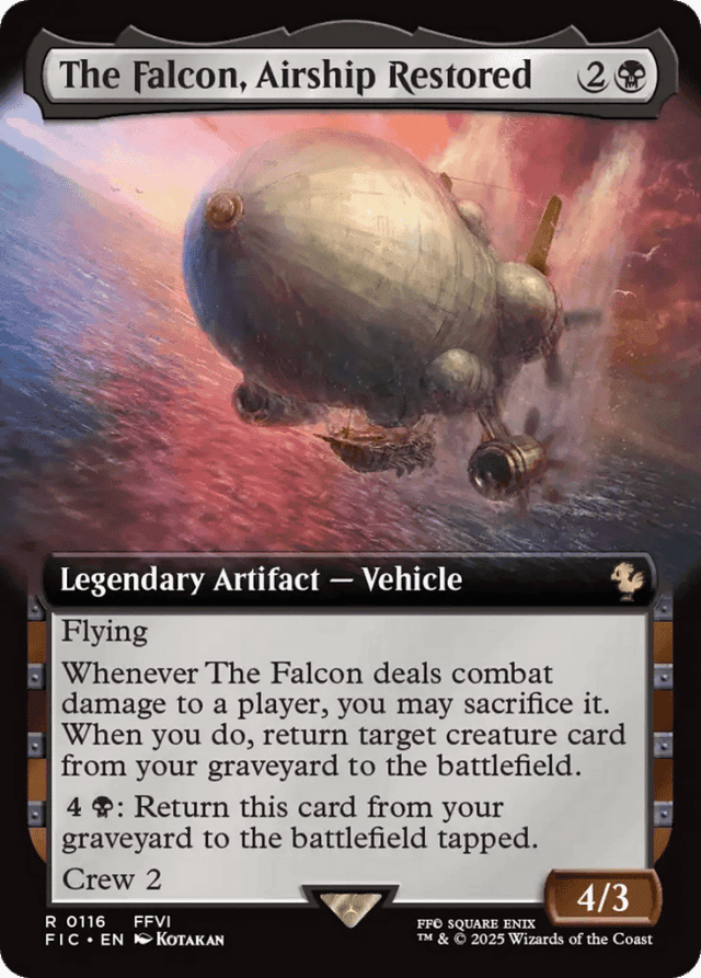 Flying Whenever The Falcon deals combat damage to a player, you may sacrifice it. When you do, return target creature card from your graveyard to the battlefield. {4}{B}: Return this card from your graveyard to the battlefield tapped. Crew 2