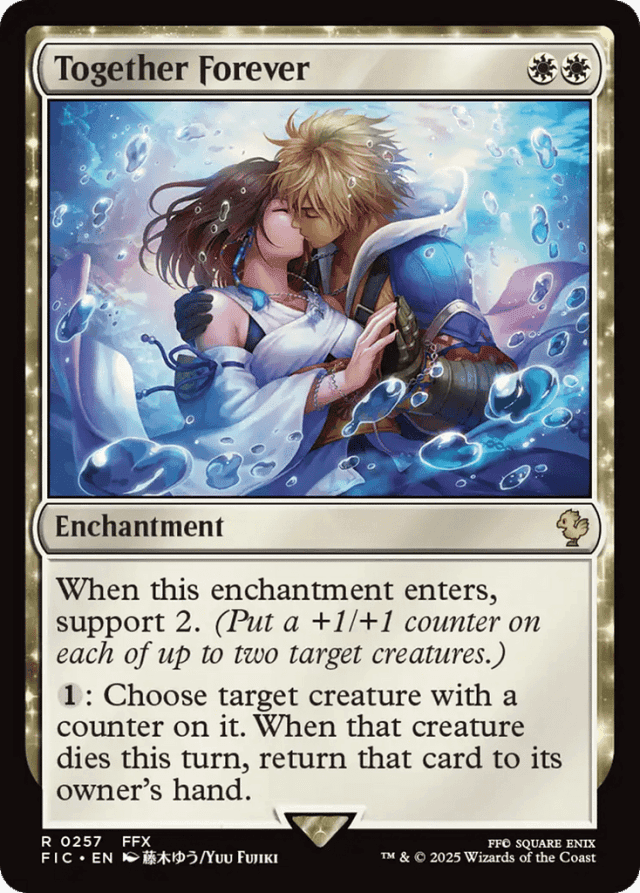 If a creature without counters receives enough -1/-1 counters to reduce its toughness to 0 or less, Together Forever's ability can't be activated before state-based actions put that creature into its owner's graveyard. — If a spell with support has other abilities that target creatures, those abilities and the support ability can target the same creature. — If some, but not all, targets for a spell become illegal, the remaining targets are affected as appropriate. If all of a spell's targets become illegal, that spell doesn't resolve. — Support can target a creature another player controls. — Together Forever's activated ability checks whether the target creature has a counter on it as the ability is activated and as the ability resolves. If the creature loses its counters later in the turn, the delayed triggered ability will still return it to its owner's hand when it dies. — You can't put more than one +1/+1 counter on any one target using the support action.