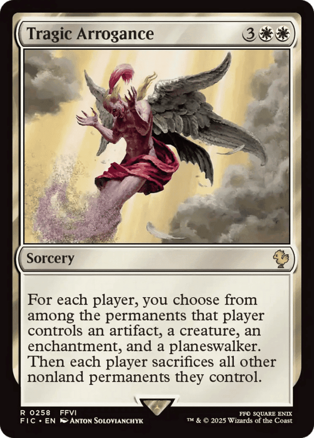If a permanent has more than one of the affected types, it can count for any of them. For example, you could choose an artifact creature as the artifact you’re sparing, another creature as the creature, and an enchantment creature as the enchantment. Similarly, you could choose an enchantment creature as both the creature and the enchantment that you’re sparing, even if the player controls another creature and/or another enchantment. — None of the chosen permanents are targets of Tragic Arrogance.