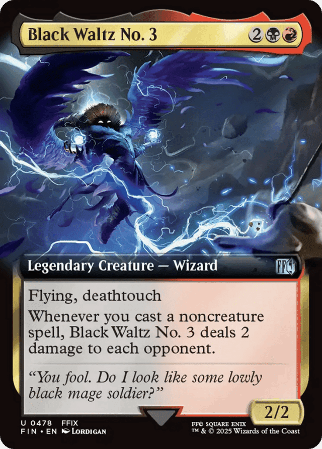 Flying, deathtouch Whenever you cast a noncreature spell, Black Waltz No. 3 deals 2 damage to each opponent.