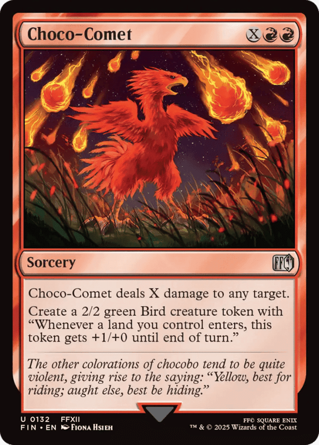 Choco-Comet deals X damage to any target. Create a 2/2 green Bird creature token with "Whenever a land you control enters, this token gets +1/+0 until end of turn."