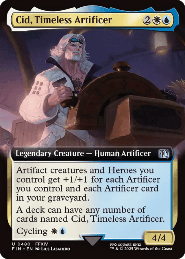 Artifact creatures and Heroes you control get +1/+1 for each Artificer you control and each Artificer card in your graveyard. A deck can have any number of cards named Cid, Timeless Artificer. Cycling {W}{U} ({W}{U}, Discard this card: Draw a card.)