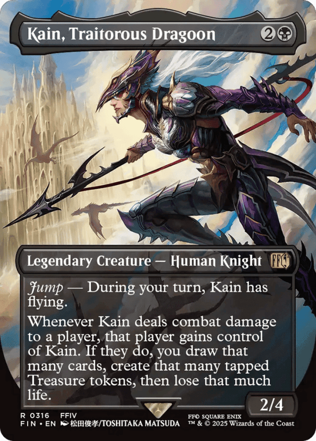 Jump — During your turn, Kain has flying. Whenever Kain deals combat damage to a player, that player gains control of Kain. If they do, you draw that many cards, create that many tapped Treasure tokens, then lose that much life.