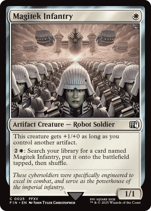 This creature gets +1/+0 as long as you control another artifact. {2}{W}: Search your library for a card named Magitek Infantry, put it onto the battlefield tapped, then shuffle.