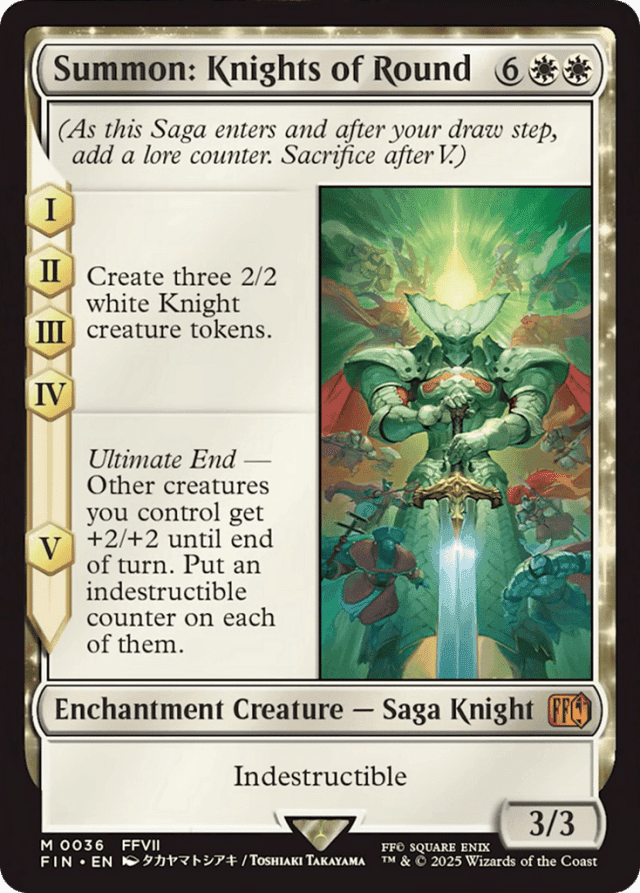 (As this Saga enters and after your draw step, add a lore counter. Sacrifice after V.) I, II, III, IV — Create three 2/2 white Knight creature tokens. V — Ultimate End — Other creatures you control get +2/+2 until end of turn. Put an indestructible counter on each of them. Indestructible