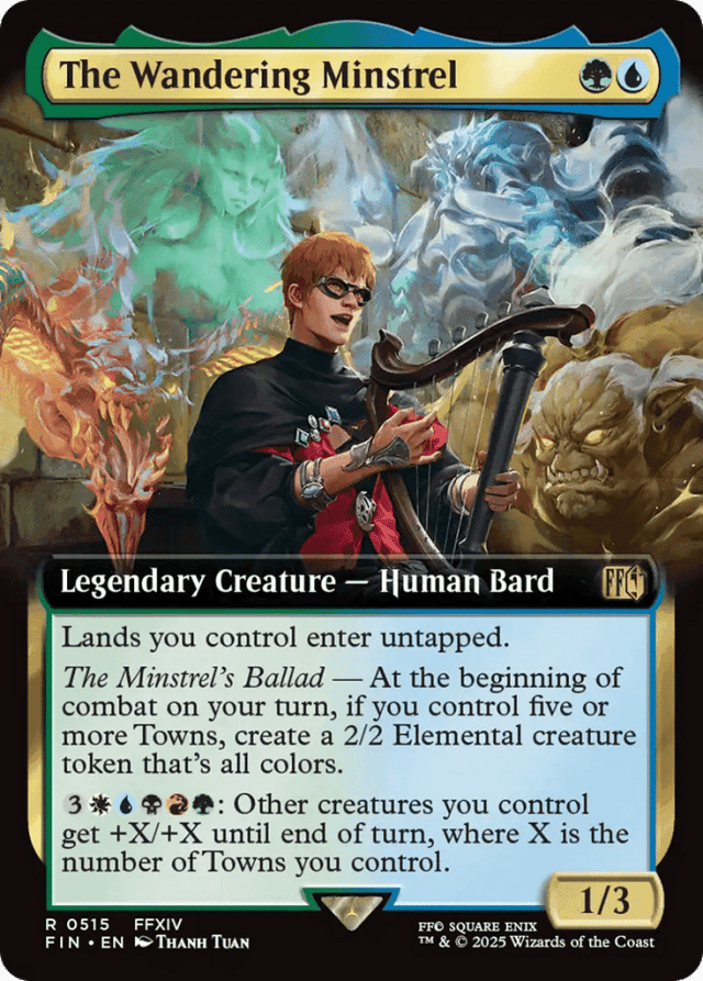 Lands you control enter untapped. The Minstrel's Ballad — At the beginning of combat on your turn, if you control five or more Towns, create a 2/2 Elemental creature token that's all colors. {3}{W}{U}{B}{R}{G}: Other creatures you control get +X/+X until end of turn, where X is the number of Towns you control.