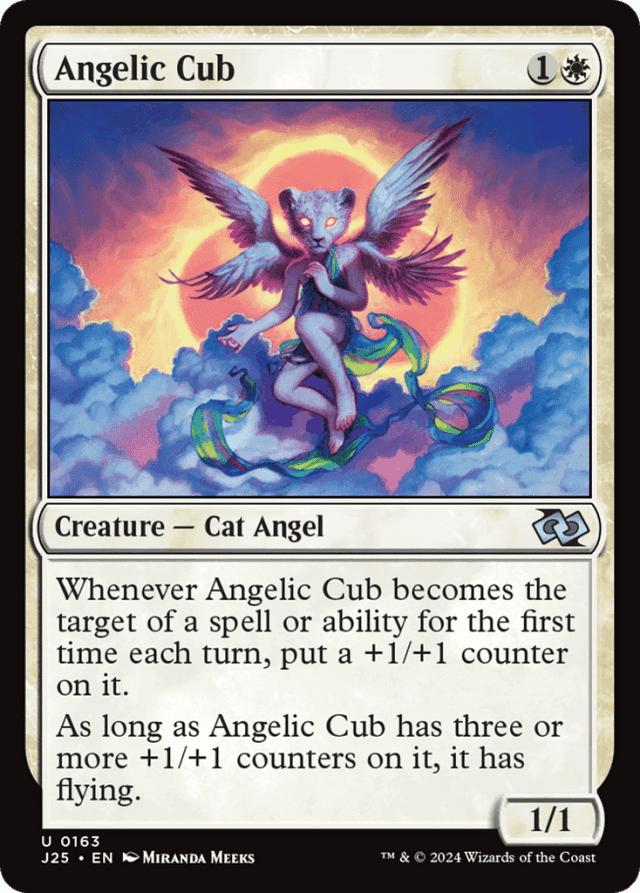 Angelic Cub's first ability will resolve before the spell or ability that caused it to trigger. — If a spell or ability has one or more of its targets changed to Angelic Cub, Angelic Cub's first ability will trigger if it hasn't yet been the target of a spell or ability this turn. — If you create a copy of a spell on the stack and target Angelic Cub, Angelic Cub's first ability will trigger as long as it hasn't yet been the target of a spell or ability this turn.