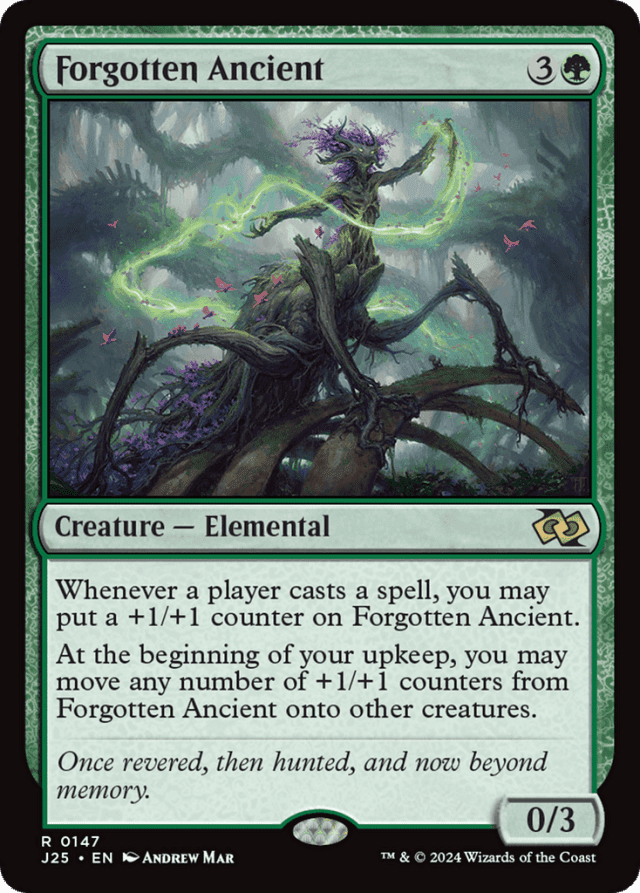 Forgotten Ancient's first ability will resolve before the spell that caused it to trigger. Putting a +1/+1 counter on Forgotten Ancient is optional. — Forgotten Ancient's last ability doesn't target any creatures. You choose how many +1/+1 counters will be moved (and onto which creatures) as the ability resolves. Notably, once the ability starts resolving and you make these choices, no player may take actions until the ability has finished resolving.
