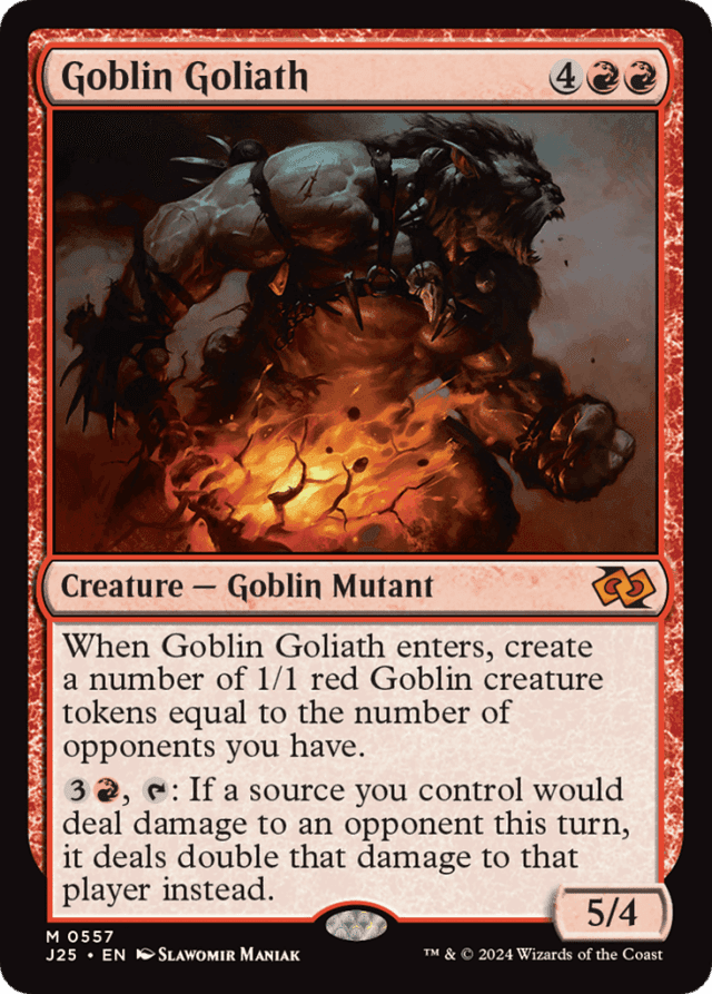 When this creature enters, create a number of 1/1 red Goblin creature tokens equal to the number of opponents you have. {3}{R}, {T}: If a source you control would deal damage to an opponent this turn, it deals double that damage to that player instead.
