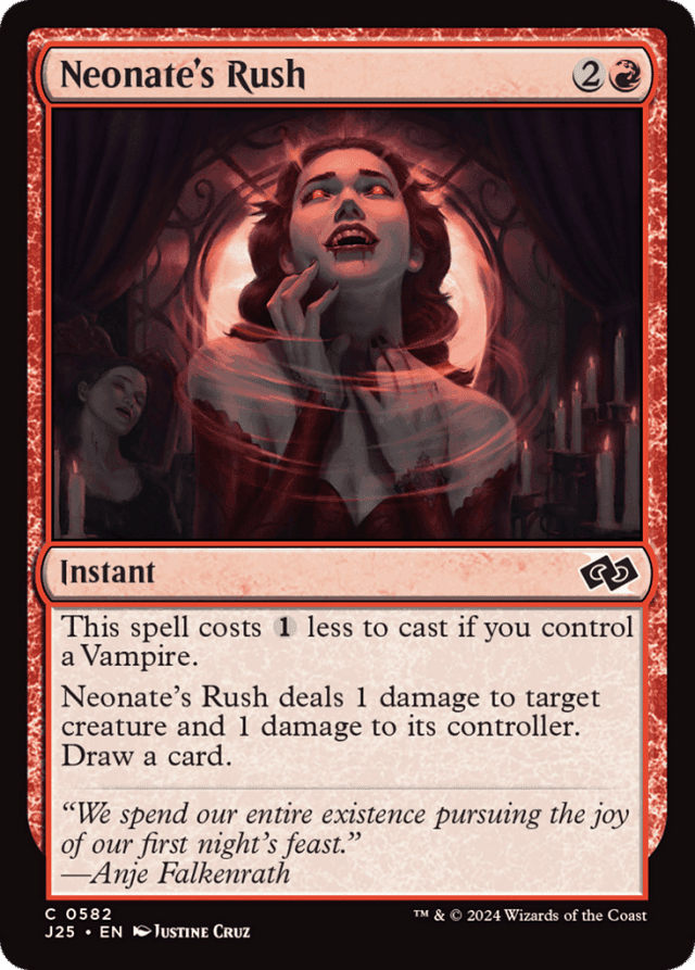 This spell costs {1} less to cast if you control a Vampire. Neonate's Rush deals 1 damage to target creature and 1 damage to its controller. Draw a card.