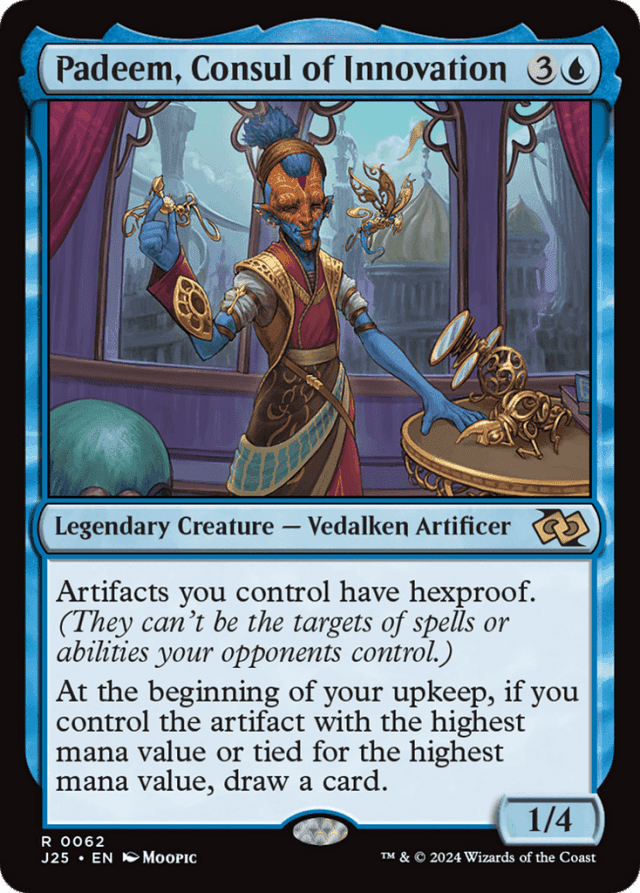 If an artifact has {X} in its mana cost, X is considered to be 0. — If you don't control an artifact with the highest mana value as your upkeep begins, Padeem's second ability won't trigger. You can't cast an instant to destroy an opponent's artifact during your turn before your upkeep begins. — If you no longer control an artifact with the highest mana value as Padeem's triggered ability resolves, you don't draw a card. — The artifact you control has to have the highest mana value only among artifacts on the battlefield, not among all permanents on the battlefield.