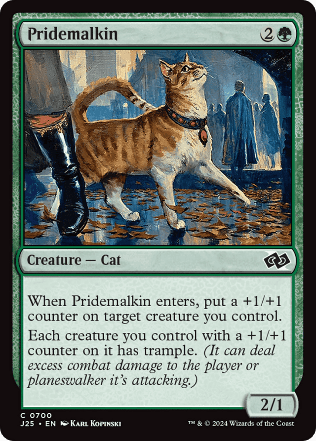 Pridemalkin can be the target of its own first ability. — Pridemalkin's second ability applies to Pridemalkin as long as it has a +1/+1 counter on it.