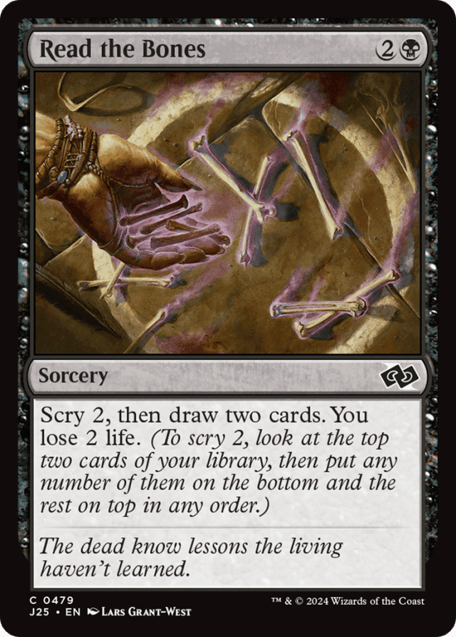 Scry appears on some spells and abilities with one or more targets. If all of the spell or ability's targets are illegal when it tries to resolve, it won't resolve and none of its effects will happen. You won't scry. — The loss of life is part of the spell's effect. It's not an additional cost. If Read the Bones doesn't resolve, you won't lose life. — When you scry, you may put all the cards you look at back on top of your library, you may put all of those cards on the bottom of your library, or you may put some of those cards on top and the rest of them on the bottom. — You choose how to order cards returned to your library after scrying no matter where you put them. — You perform the actions stated on a card in sequence. For some spells and abilities, that means you'll scry last. For others, that means you'll scry and then perform other actions.