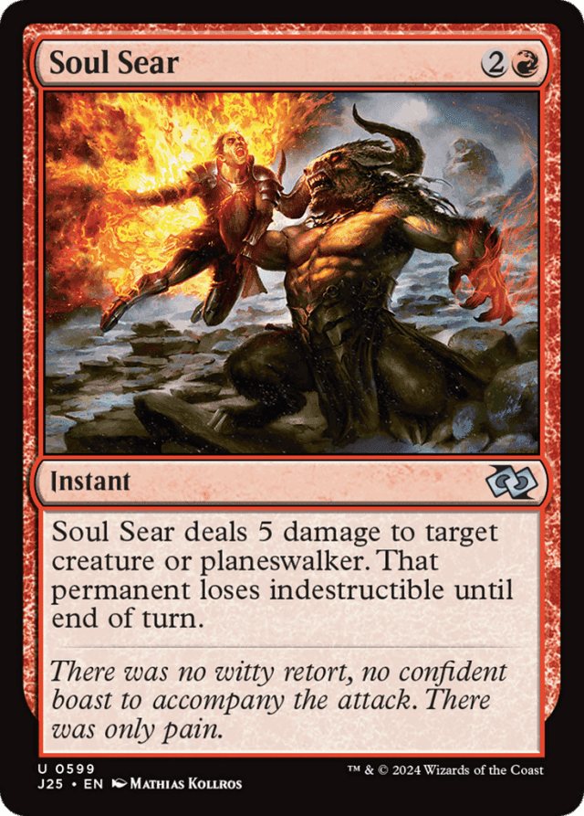 Soul Sear deals 5 damage to target creature or planeswalker. That permanent loses indestructible until end of turn.